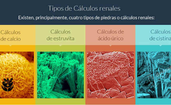 Se tienen los cálculos a base de oxalato de calcio, fosfato de calcio, acido úrico y por cistina, cada uno de ellos con factores diferentes en la formación, lo que se puede ingerir en uno no se puede consumir en otro, por ende se necesita comprender cuál es la composición principal del cálculo para establecer la dieta correcta.